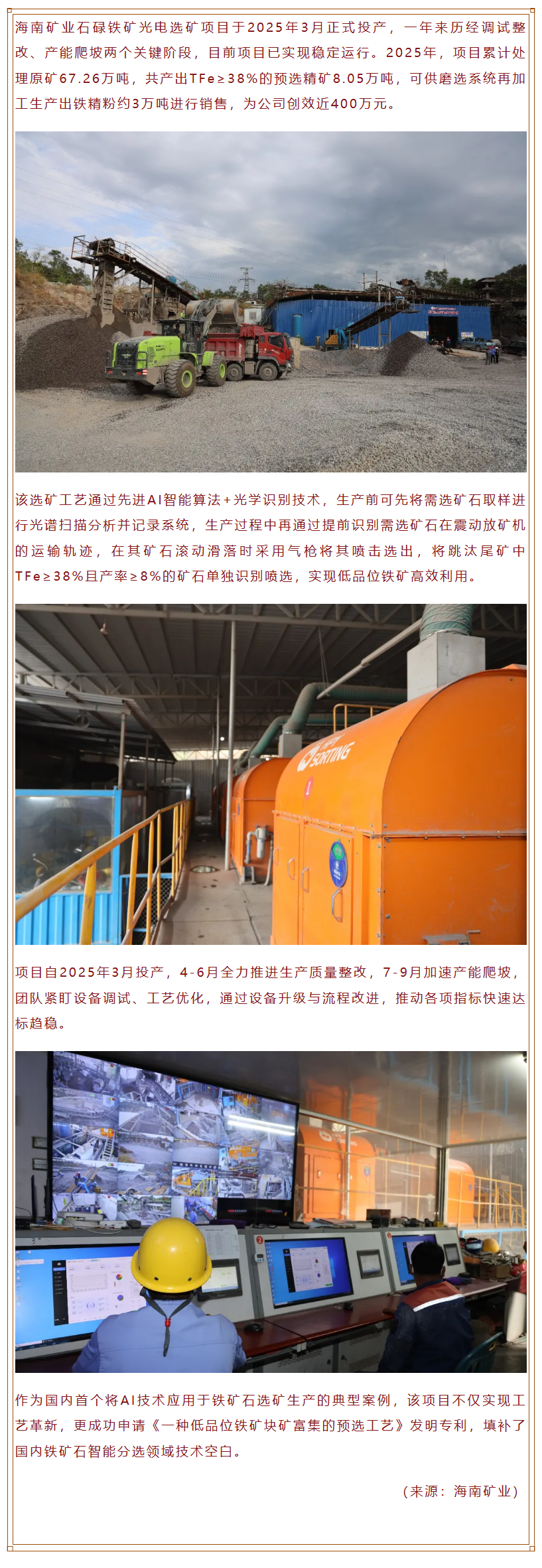 AI赋能技术革新 石碌铁矿光电选矿取得良好成效