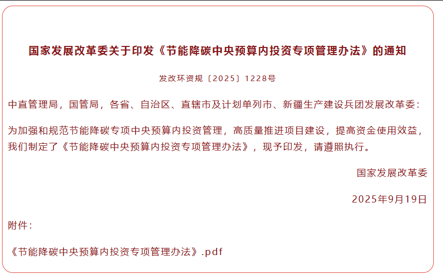关于印发《节能降碳中央预算内投资专项管理办法》的通知(发改环资规〔2025〕1228号)