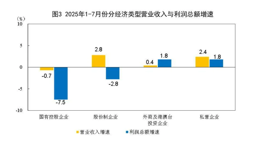 1—7月份,规模以上工业企业中,国有控股企业实现利润总额12823.4亿元,同比下降7.5%;股份制企业实现利润总额29742.5亿元,下降2.8%;外商及港澳台投资企业实现利润总额10216.7亿元,增长1.8%;私营企业实现利润总额11183.7亿元,增长1.8%。